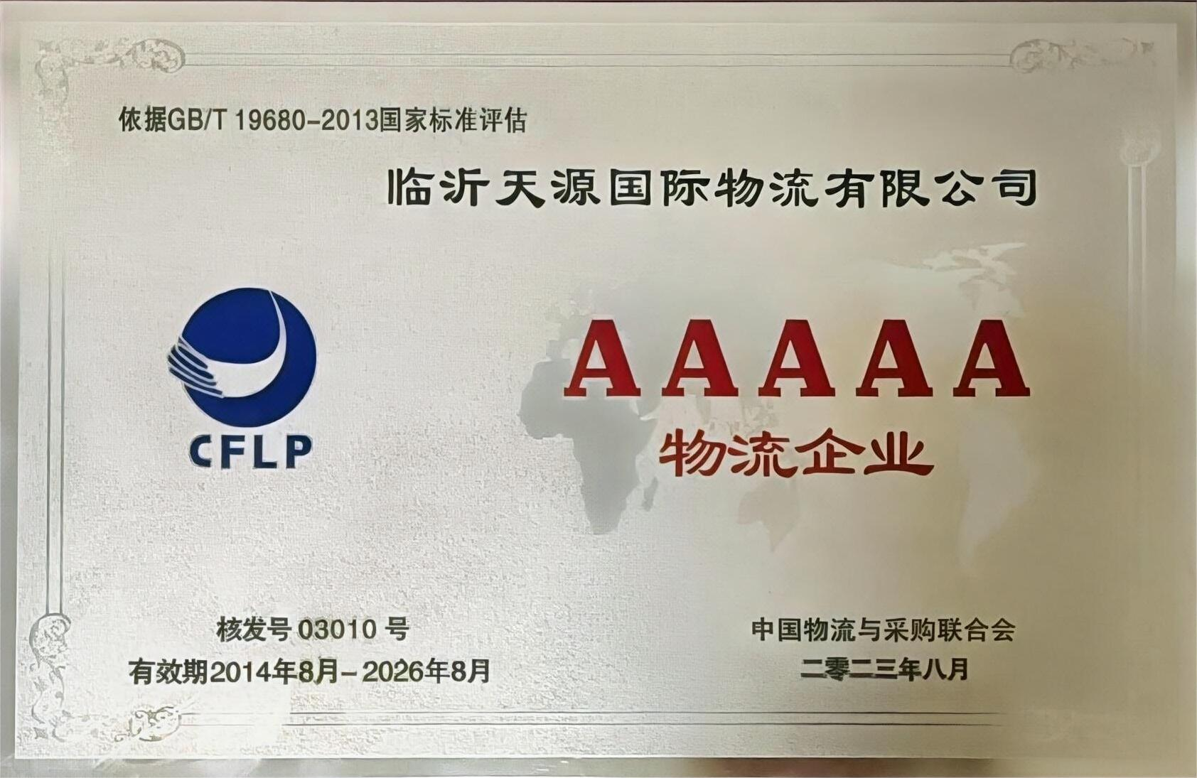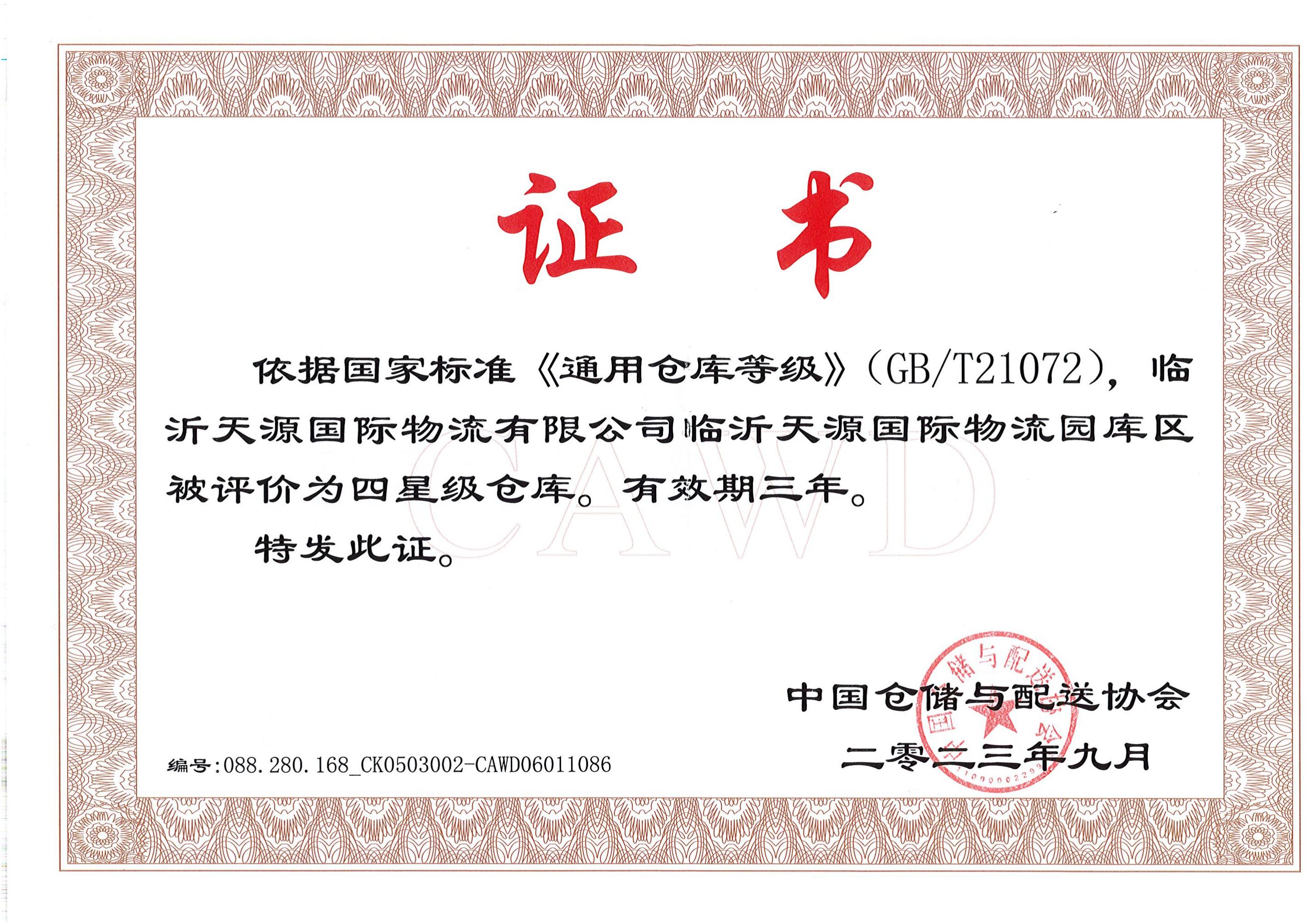 九月份,臨沂天源國際物流有限公司順利通過中國倉儲與配送協(xié)會專家組審核、現(xiàn)場查看、評估,榮獲中國倉儲與配送協(xié)會“四星級倉儲”榮譽稱號。